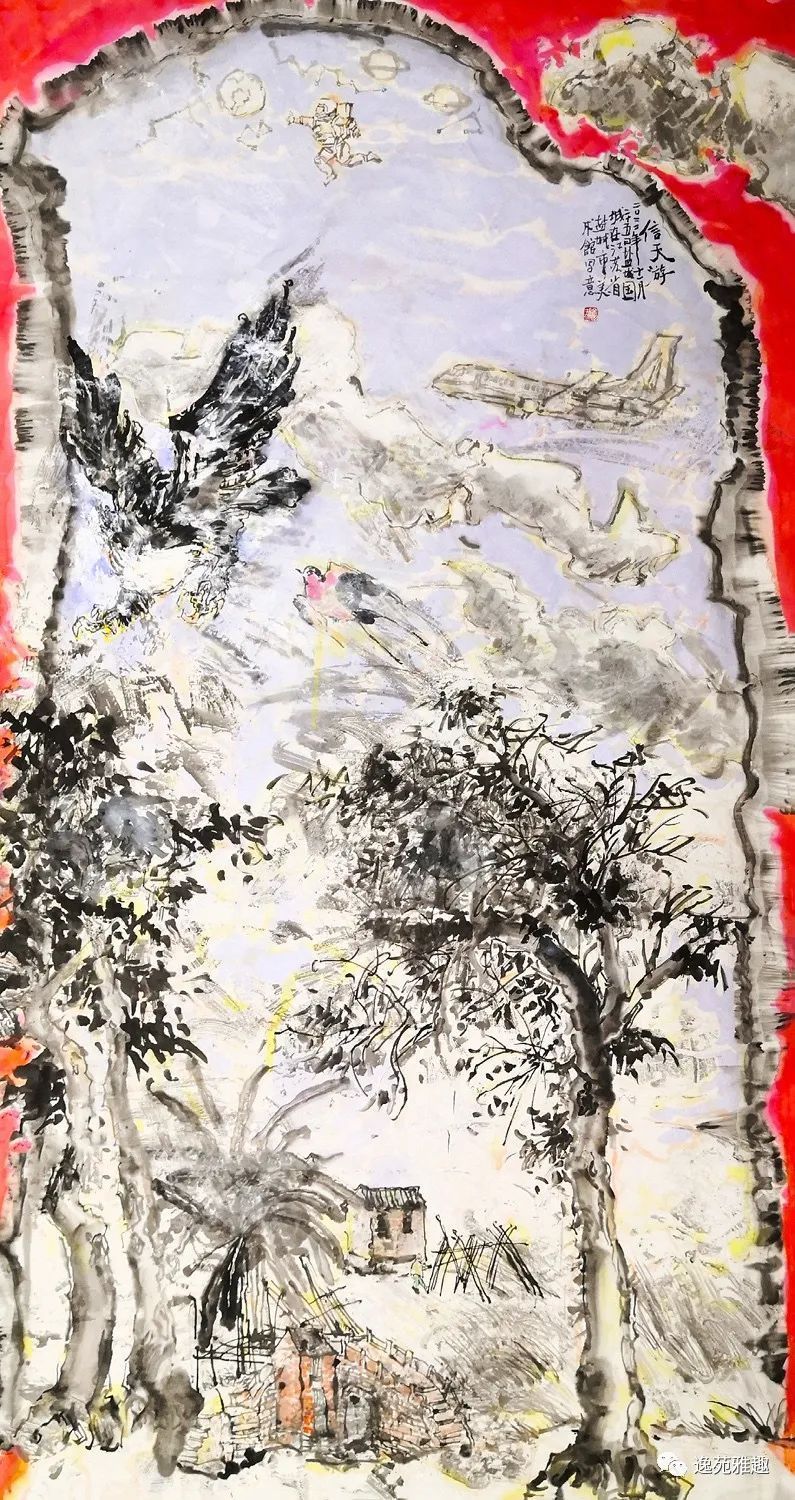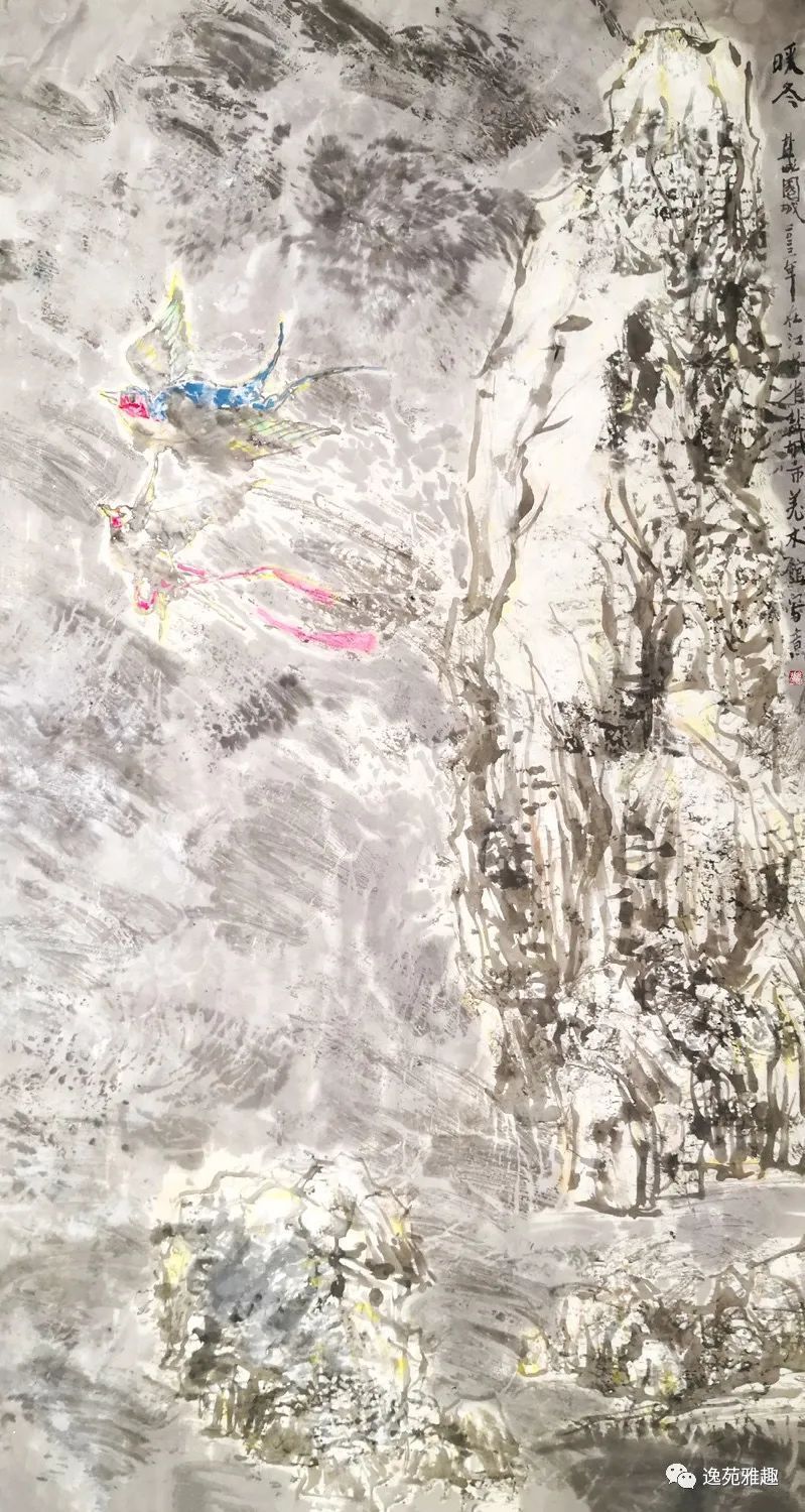 余国城的花鸟画别具一格。题材方面,他注重聚焦社会生活以及风土人情,一改传统花鸟的“精景”之风,是为现实主义花鸟。笔触方面,他主张线与色的交融,宛若吴道子的风格。如此一来,现实主义的题材,加上现代主义的笔触,便形成了精妙绝伦、生动形象的花鸟画作品。