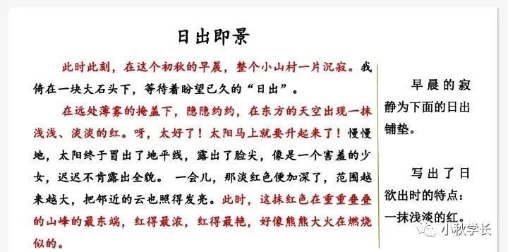 如,观察日出,要重点观察日出时太阳形状的变化、周围云霞色彩的变化,以及大地明暗的变化;观察天空的云,要重点观察云的形状变。化及色彩变化;观察下雨的场景,可按照雨前、雨中、雨后的顺序,重点观察雨的大小、声音、雨中景物的变化及人或动物的表现等。