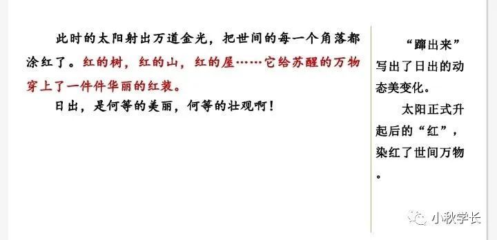 片段一:春天最美是黎明。东方一点儿一点儿泛着鱼肚色的天空,染上微微的红晕,飘着红紫红紫的彩云。