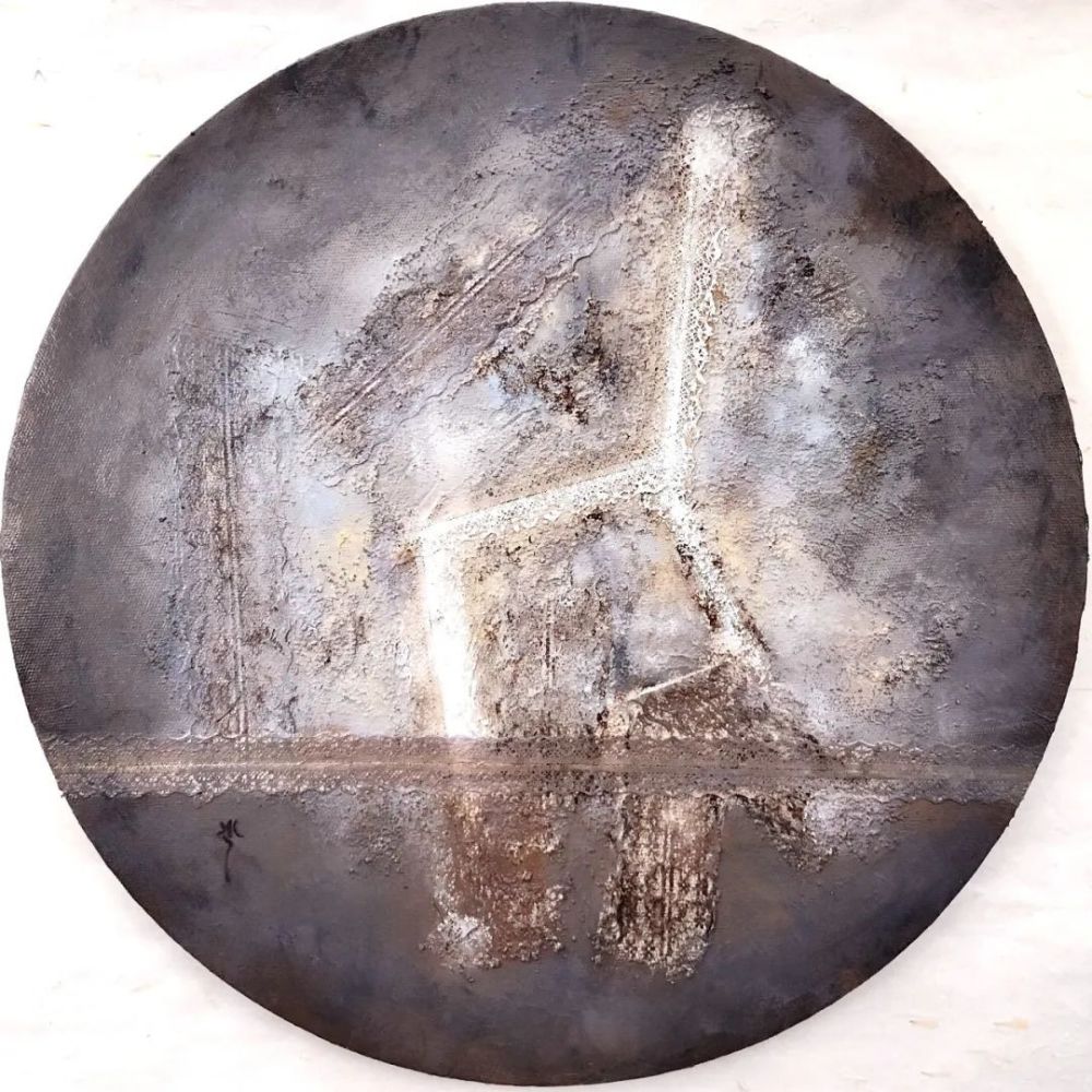 张少婷 B01-《板凳上的风景》 直径50cm 清浆麻布油彩 石泥 植籽 织物 2022