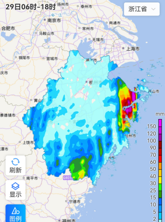 29日,浙江沿海和浙南地区阴有中到大雨,部分暴雨,局部大暴雨。浙北沿海海面有8~9级阵风;沿海地区和高山区也有8-9级阵风,其中个别地区伴有短时10-11级雷暴大风。当日14时至16时,宁波北仑区青林村面雨量达到118.9mm,同时小时雨强最大78.4mm。