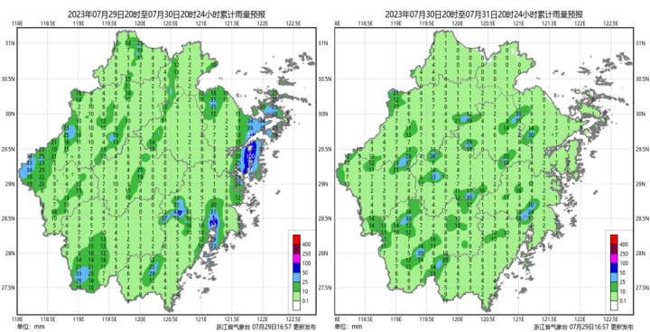 今年第5号台风“杜苏芮”,历时长、雨强大,已给我省沿海和浙南大部地区带来强降水,暴雨致灾风险大,需特别注意防范小流域山洪、地质灾害、城乡积涝等次生灾害。浙江省气象台预计,30日,全省部分地区仍有阵雨或雷雨。7月31日,也许是浙江近期天气最好的一天——全省多云,午后到夜里部分有雷阵雨。