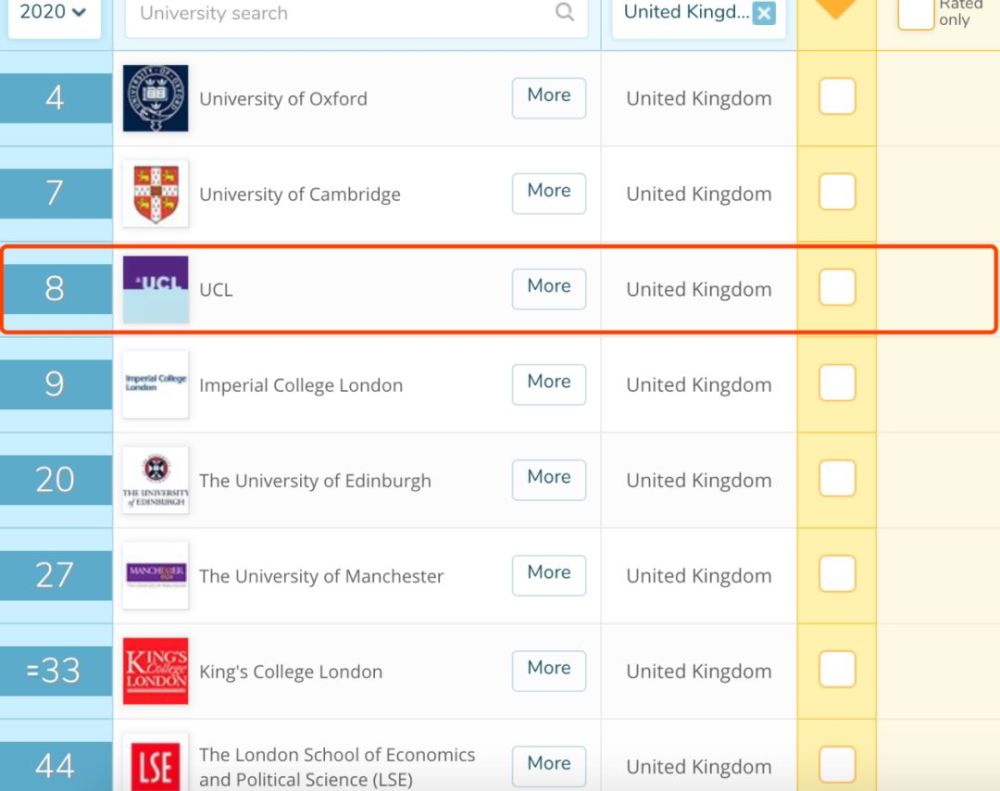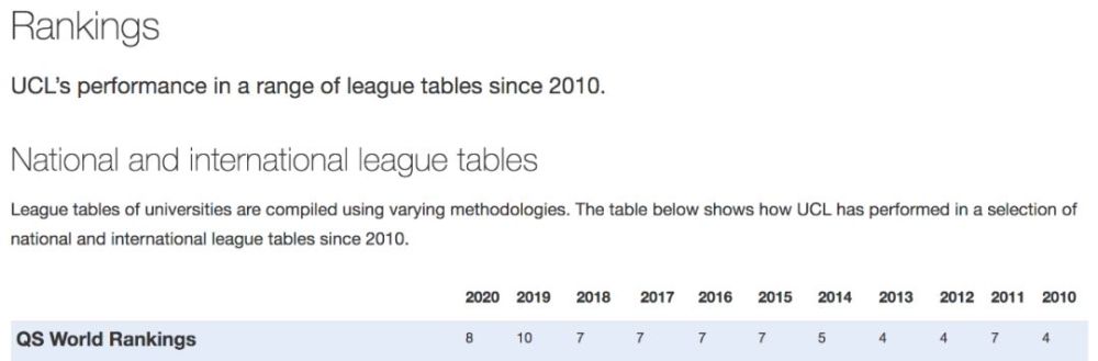 同时在与IC和LSE的竞争当中,UCL在排名上也总是略胜一筹,虽然2019年被IC超越,但在最新的2020年QS排名中,UCL重回到英国大学前三,仅次于牛剑。