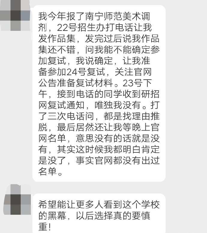 调剂挂了七天,报了之后给学院打电话推给研招办,但是研招办没有电话只有邮箱,邮箱发过去之后石沉大海。此外还有一些同学的反馈:南宁师范大学美术调剂。