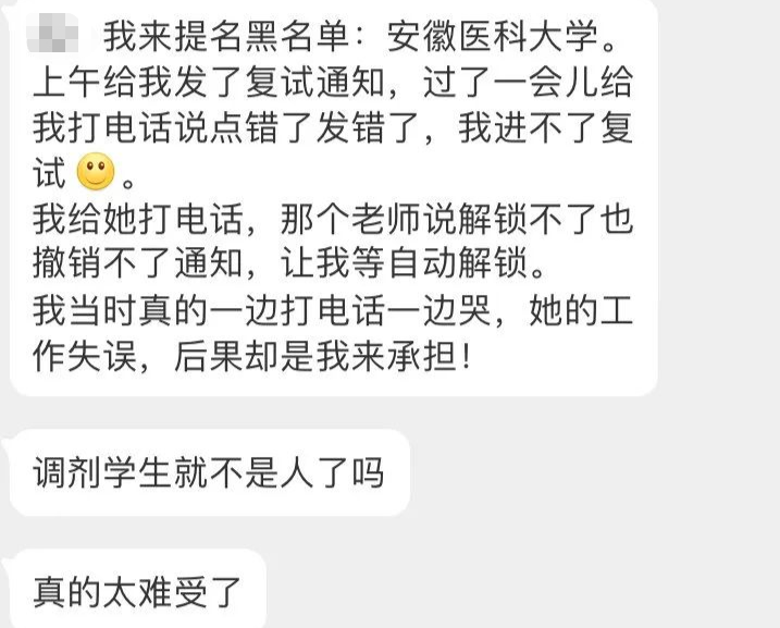 信息都被学校提走了,三十六个小时锁定也结束了,学校调剂系统也录入了,连模拟面试设备都调试过了,下午就要复试面试了,结果教务处打电话说为什么研招网那边没有继续填自己的信息!! 然后就告诉对方没有复试资格了!!如果是真的,这真的不太负责任。