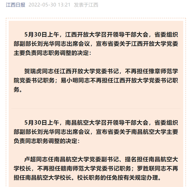 这次江西任命贺瑞虎为江西开放大学书记。公开资料显示,贺瑞虎是江西莲花人,出生于1965年7月。从履历来看,贺瑞虎不仅有地方有关部门担任领导的经历,更是有丰富的高校任职的经历。比如,贺瑞虎早年曾任职江西师大,担任过该校政法学院副教授、副院长,另外还在南昌师范高等专科担任过校长,南昌师范高等专科学校升格更名为豫章师范学院后,出任书记。