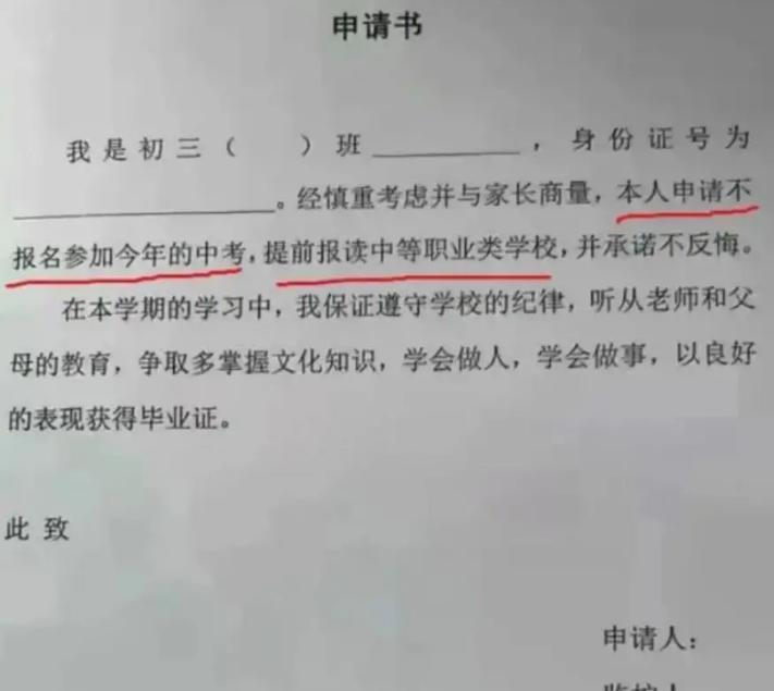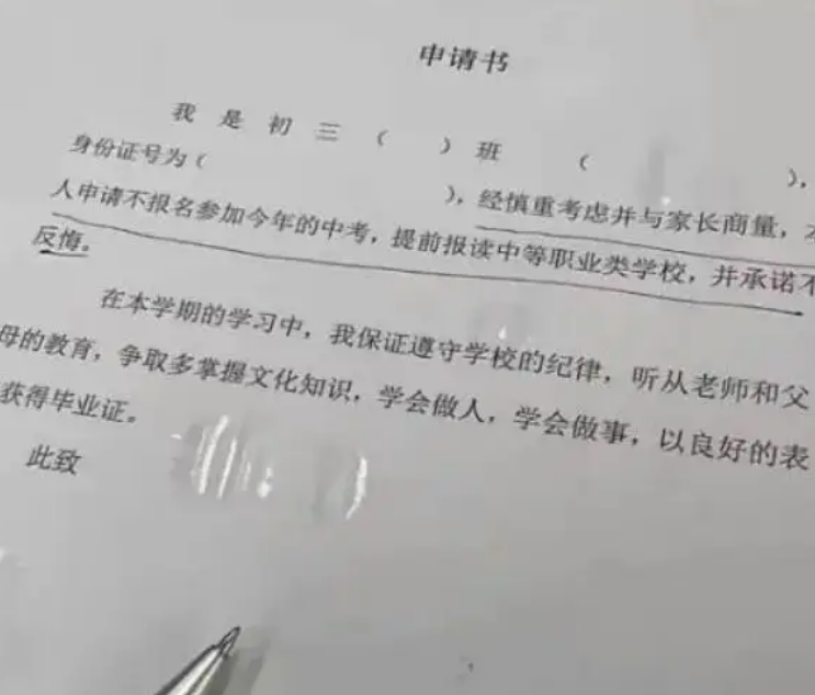很多家长去质问老师,得到的回答却是这个申请书的出发点也是为了学生好,因为比较正规的职高是有提前招生的,先签申请书的人就等于有了保障,否则等到中考落榜之后,连职高就选不到好的了。