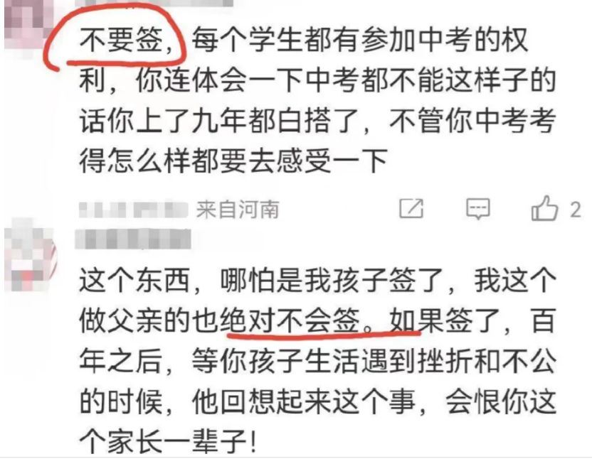 这种放弃中考申请书看似是学生和家长自愿签署,但是架不住很多老师频繁的给家长和学生施压,甚至有些家长自己对中考乃至于教育了解的并不多,从而觉得老师说的有道理,就可能会签字。