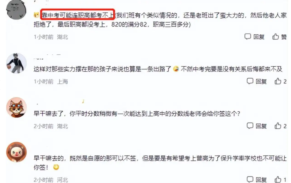 但是却有些网友觉得收到申请书的同学都是考不上高中了,签字拒绝中考可以提前有更多的选择,比如上职高。而且现在的职高和之前也是以往不同,学生可以提前选择专业,也有机会考上好的大学,一时间大家议论纷纷。