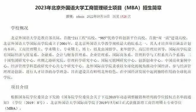北京外国语大学发布了2023年工商管理硕士项目招生简章。