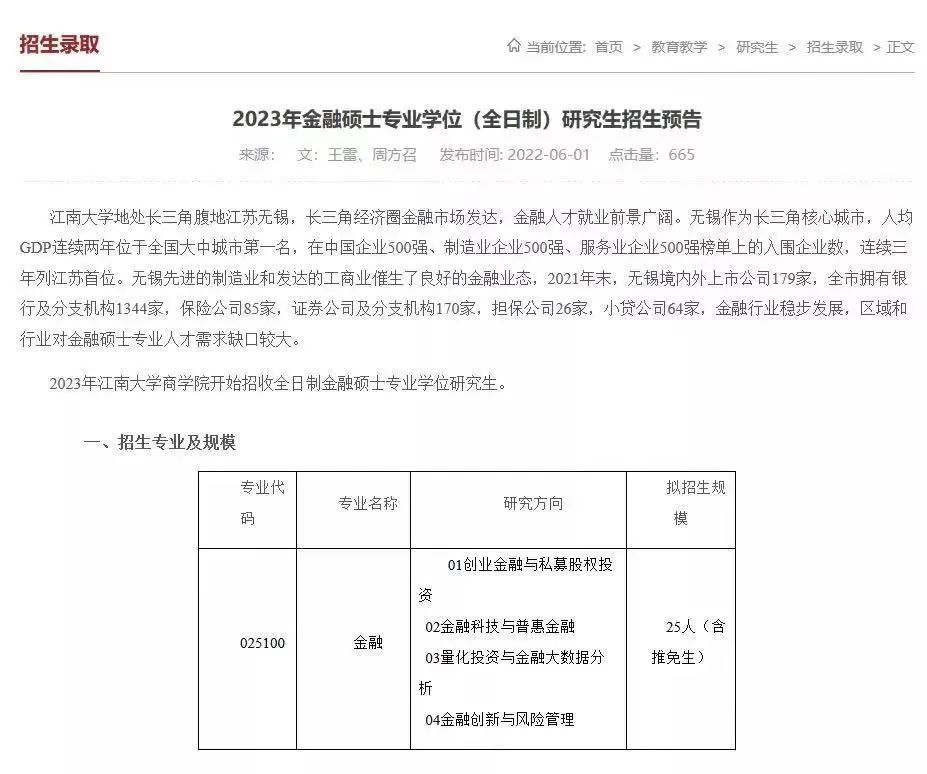 江南大学商学院公布了2023年金融硕士专业学位(全日制)研究生招生预告。