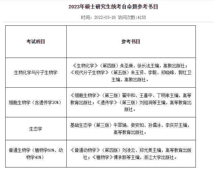 浙江大学生命科学学院,3月16日公布了2023年硕士研究生统考自命题参考书目。