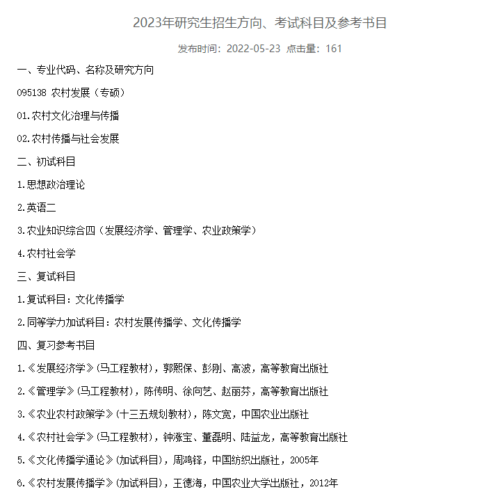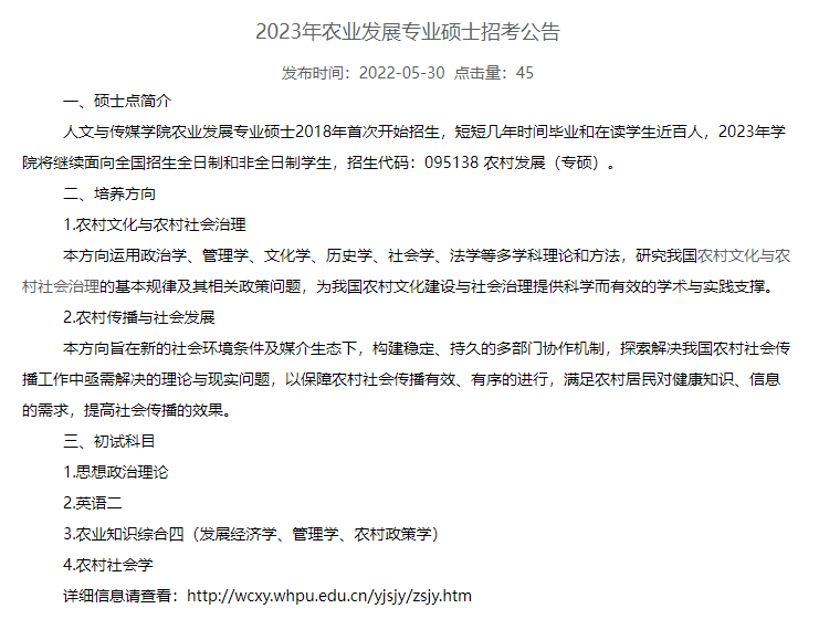 武汉轻工业大学人文与传媒学院,5月30日公布了2023年农业发展专业硕士招考公告,5月23日公布了招生方向、考试科目及参考书目。