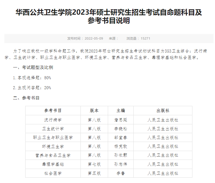 在5月9日,华西公共卫生学院公布了2023年硕士研究生招生考试科目。