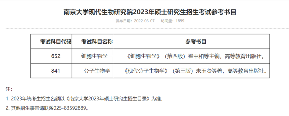 南京大学现代生物研究院已公布2023年硕士研究生招生考试参考书目。