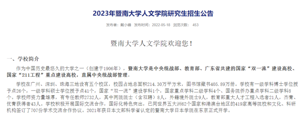 暨南大学人文学院,于5月18日公布了2023年研究生招生公告。