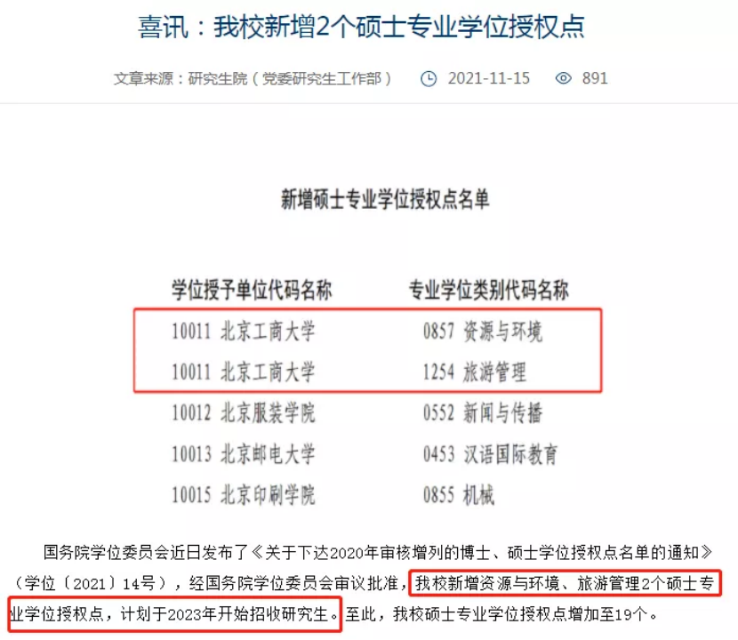 新增资源与环境、旅游管理2个硕士专业学位授权点,计划于2023年开始招收研究生。