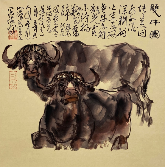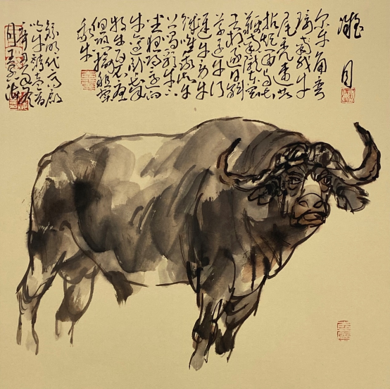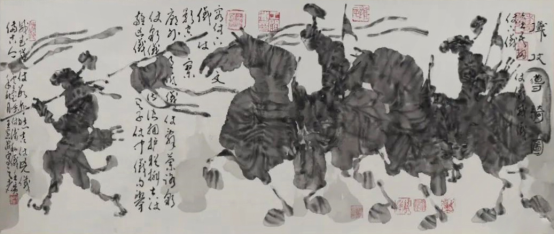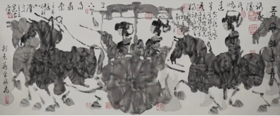 三:一百年前以徐悲鸿为代表的上一代画家的历史使命是“全面引进”,而一百年后当代画家的使命是“综合提高”。王阔海先生将东方的、西方的、古典的、现代的、学院派的,文人画等六大方面进行综合,发扬光大了徐渭、八大的笔黑精髓,结合了自创的中国画素描,在新汉画与牛羊鞍马大写意领域完成了中西绘画的无鏠连接与融合,解决了以徐悲鸿为代表的上一代画家尚未解决的一大课题。把当代中国画的大写意和当代文人画发展到了一新的高峰。