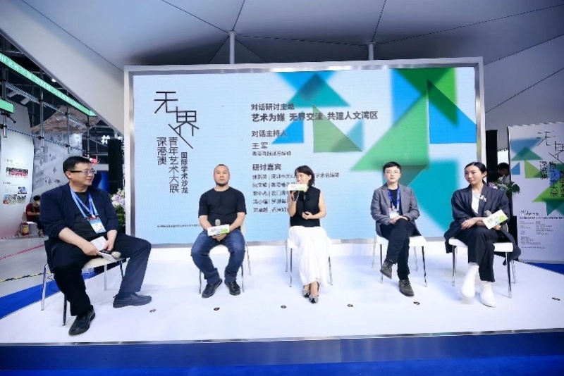 此外,在学术主题对话环节,香港商报副总编辑王军与四位深港澳艺术家围绕艺术为媒,无界交流,共建人文湾区主题,结合各自在艺术创作上的见解、自身经历,进行交流分享。