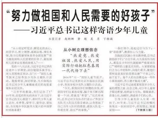 5月31日,《人民日报》刊发报道《“努力做祖国和人民需要的好孩子”——习近平总书记这样寄语少年儿童》。