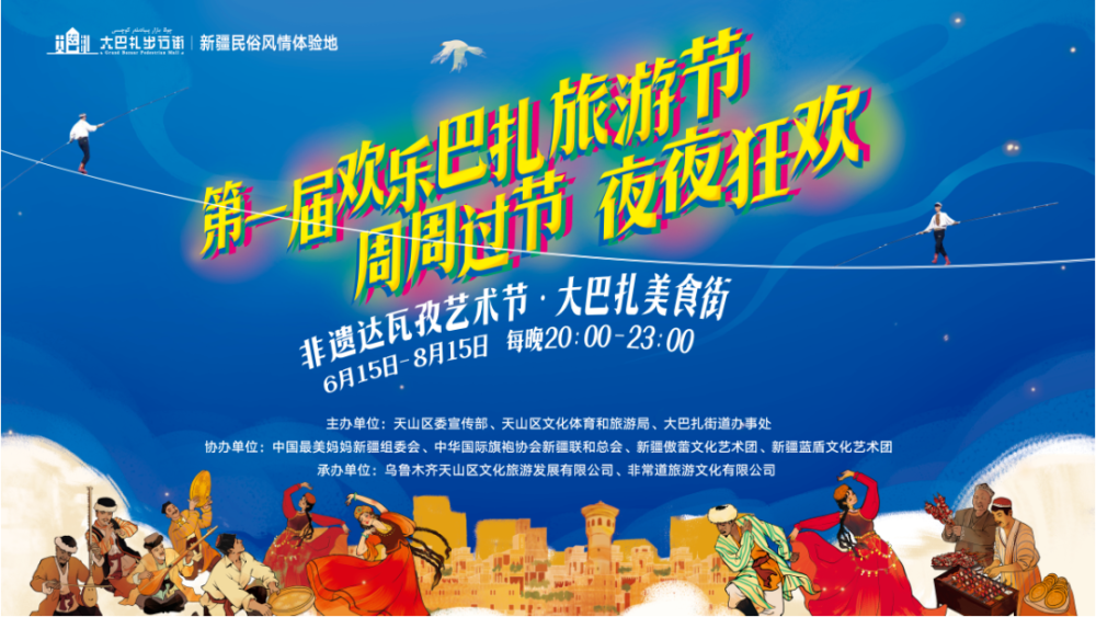 重磅好消息,大巴扎美食街恢复营业。6月15日—8月15日,每晚20:00—23:00,大巴扎美食街达瓦孜欢乐广场中央舞台节目多多,周周过节,夜夜狂欢!