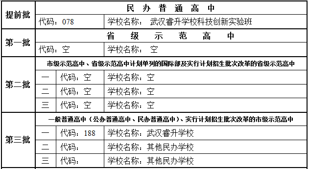 以武汉睿升学校为例,学校是市示范高中,又是民办高中,有提前批、市示范、一般普高共三个批次填报。学校有科创班(科创班又分科创优班、科创次优班和科创班平班三个不同的层次),有平行班,不同层次的班级有不同的录取线。