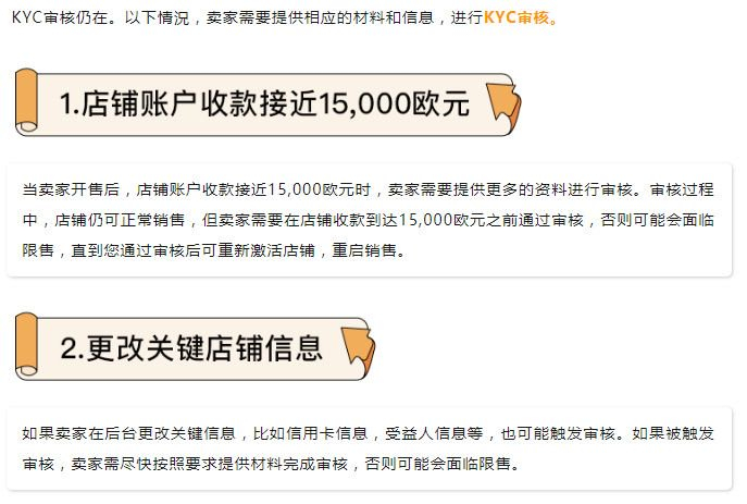 不过在一定情況下,卖家需要提供相应的材料和信息,进行KYC审核,比如当卖家开售后,店铺账户收款接近15000欧元时,卖家需要提供更多的资料进行审核;或者卖家在后台更改关键信息,例如信用卡信息,受益人信息等。