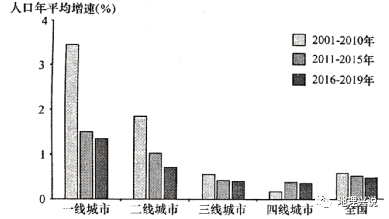 2.根据图中信息,一、二线城市人口年平均增速明显下降,说明城市化进程放缓,A正确;根据图中信息,三四线城市人口年平均增速低于全国平均水平,因此不可能人口大量回流到三、四线城市,B错误;与三四线城市相比,一二线城市人口年平均增速明显高于三四线城市,说明一、二线城市竞争力没有明显下降,C错误;四线城市的人口年平均增速,2016-2019与2011-2015相比平均人口年平均增速有所下降,说明四线城市对人口引力并没有不断增强,D错误,所以选A。