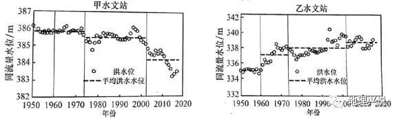 水库的使用及泥沙的冲淤都会影响河流水位变化。下图为我国某河流两个水文站1950~2020年洪水位变化统计围。1957年,该河一大型水库投入使用。近年来,随着流域的治理。当地生态环境不断改善。据此完成下面小题。