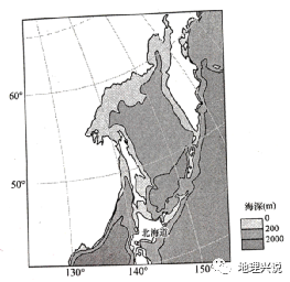 (1)读图及材料信息“有专家称阿伊努人的祖先是从亚洲北部迁徙而来”可知,阿伊努人祖先从亚洲北部到北海道之间的沿途陆地面积广大,中间有狭窄的海域,水面较浅,便于人们渡过海域;另外,当处于地质时期的寒冷期时,海水结冰,导致海平面下降,形成北海道和亚洲北部的冰桥,人们通过冰桥迁徙到北海道,线路如图所示: