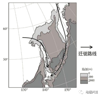 理由:沿途海域较窄(陆地多),水深浅,便于渡海;海水结冰(海平面下降),使北海道和大迁徙路线陆相连,便于迁徙。