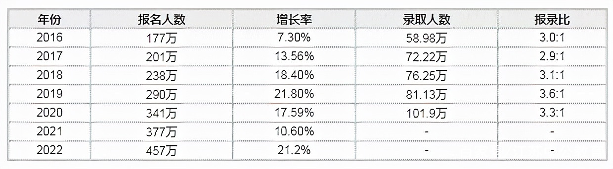 457万!可以说是增长幅度比较大了,去年全国硕士研究生招生考试报名人数377万人,同比增长80万,增长幅度高达21.2%,历年汇总如下:
