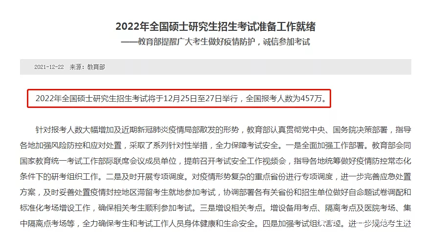 ①2022年全国硕士研究生招生考试全国报考人数为457万;