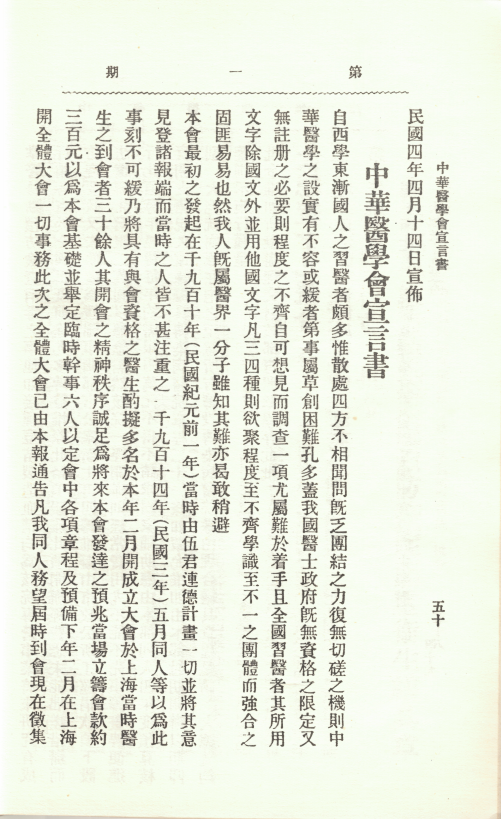 1915年2月5日,颜福庆等21人在上海集会,成立中华医学会。颜福庆被推选为首任会长。在颜福庆起草的《中华医学会宣言书》中,他阐述中华医学会宗旨为:巩固医家交谊,尊重医德医权,普及医学卫生,联络华洋医界。