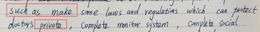 这个句子中的问题有两个,首先such as 后面应该接短语或单个词,而不是句子,所以make 就不能使用原形了,必须改成 making 或to make;其次,doctor’s ,制定法律肯定不是为了保护一位医生的隐私,所以 名词先变复数,再加’, 改成 doctors’。同时,还有没转换词性的问题,private 是形容词,不能用作protect的宾语,应改成 privacy.