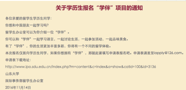 记者查询发现,早在2016年,山东大学官网曾发布一份《关于学历生报名“学伴”项目的通知》,其中写道,留学生办公室可以为你介绍一位“学伴”,你可以和“学伴”一起学习语言,一起讨论生活,一起参加活动,一起品味美食。