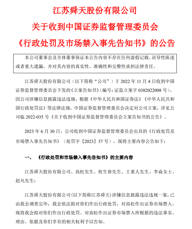 在被立案近七个月后,近日,江苏舜天收到《行政处罚及市场禁入事先告知书》。