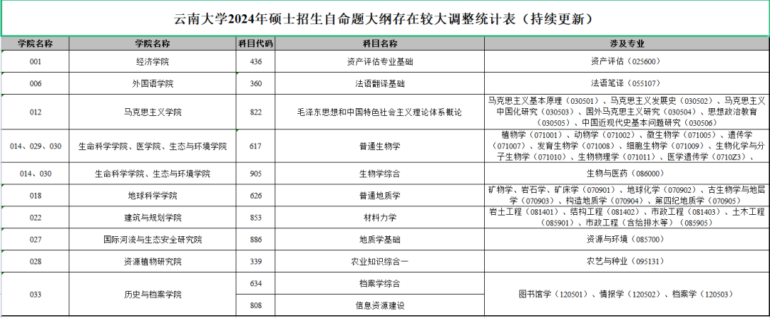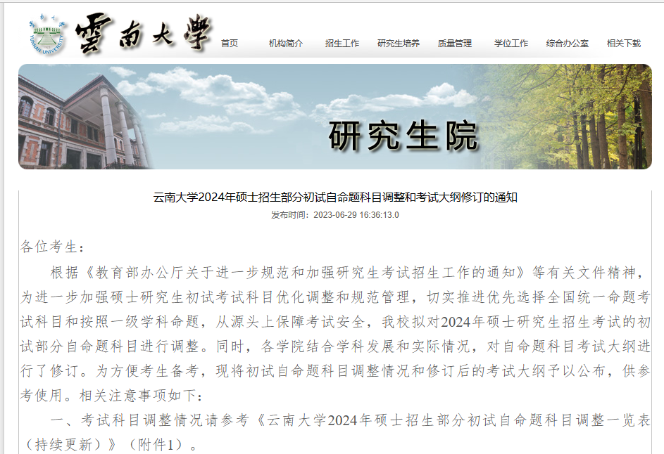 不过,正因为云南大学报考热度很高,竞争也相对激烈一些,最近,云南大学又发布了“云南大学2024年硕士招生部分初试自命题科目调整和考试大纲修订的通知”,公告中显示,云南大学对一些考研初试科目作出了调整。