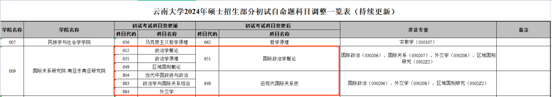 虽然考试科目发生了很大的调整,但是根据云南大学研究生院发布的公告附件“云南大学2024年硕士招生自命题大纲存在较大调整统计表”显示,目前国际关系研究生院的政治学相关专业自命题的考试大纲并没有较大变化,有意向报考的同学也不用太紧张,具体如下图: