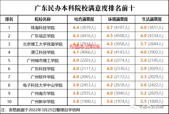 从表格上可以看到,院校满意度分综合满意度、环境满意度以及生活满意度。排名前五的是珠科、培正、北理珠、湛科、广城理。值得一提的是,珠科在三个满意度都是民办院校的第一,且都在4.0评分以上。