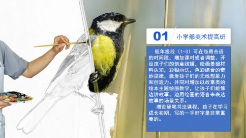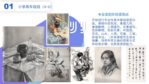 1,小学高年级段(4-6)挑选学生成立美院附中方向造型专业提高班。(开设课程:素描几何体,素描静物临摹及写生,素描石膏像写生,人物速写临摹及写生,风景速写,色彩静物临摹及写生,真人头像临摹及写生)。从长远角度来看,小学高年级段的孩子已经具备一定的思维理解能力和认知判断能力,如果对于美术感兴趣的学生可以乘早接受美院系统的专业学院派的艺术教育和专业技法训练,在未来的中考和高考时会有极强的过人优势。教学要求严格按照美院附中的要求循序渐进的专业教学体系来进行。完全提升孩子们的美学认知水平。有目标,有可为!