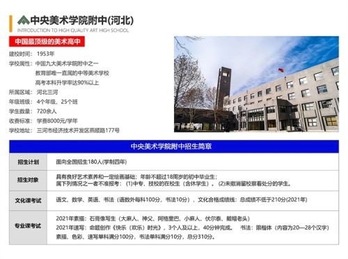2,初一至初二年级选拔学生成立美院附中考前班,(文化课要求过测试)。国美附中文化课考试科目:语文、数学、英语,专业考试科目:素描、色彩、速写。中国美院附中综合分算分公式:(文化总分除以360乘以50%+专业总分除以300乘以50%)乘以100。