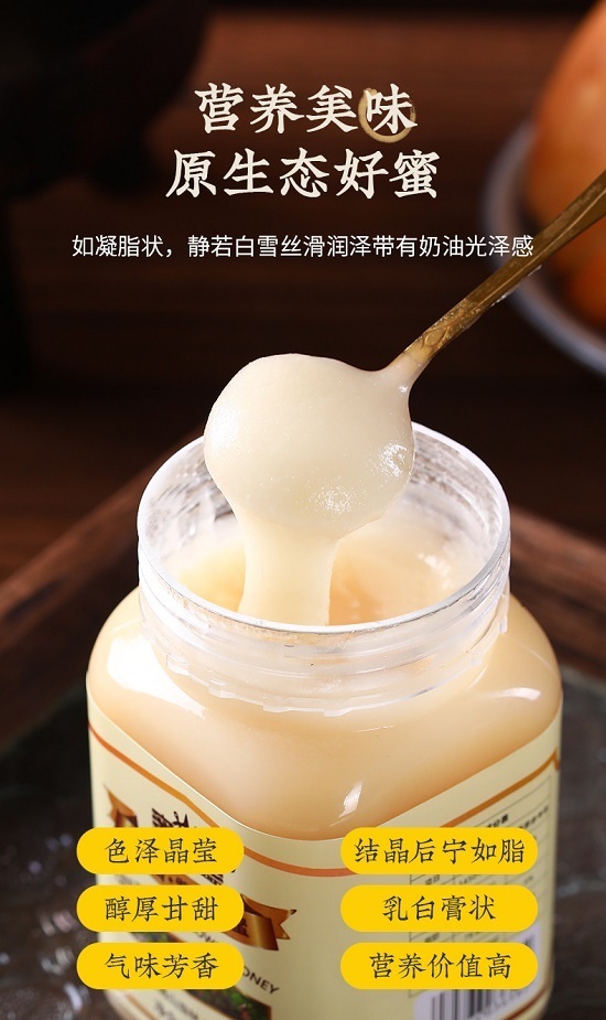 它呈乳白色的膏状,经过结晶后更显脂肪般柔滑,宛如凝脂般细腻。这种蜜糖静若白雪,质感丝滑润泽,还带有一抹奶油般的光泽感。
