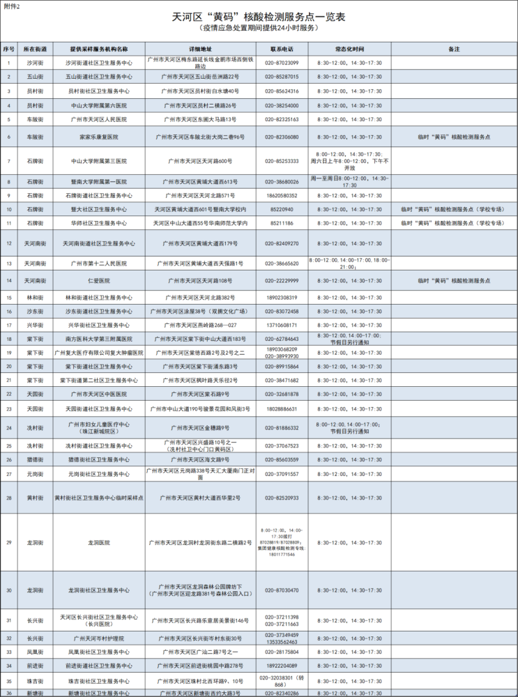 五、请持“粤康码”黄码或收到短信提醒的居民朋友,就近前往黄码核酸采样点进行核酸检测(详见附件2)。如有发热、干咳、乏力、嗅觉和味觉减退、鼻塞、流涕、咽痛、结膜炎、肌痛、腹泻等十大症状,请您做好防护措施,避免乘坐公共交通工具,尽快前往附近医疗机构发热门诊就诊。