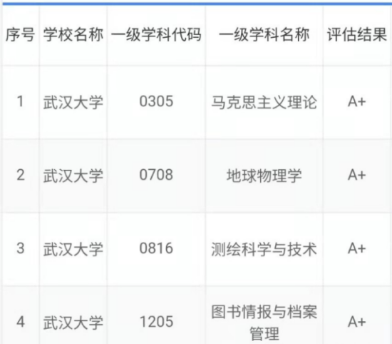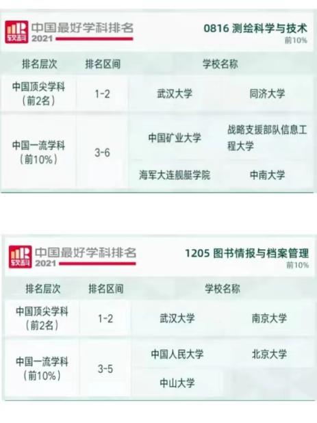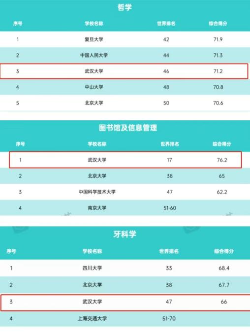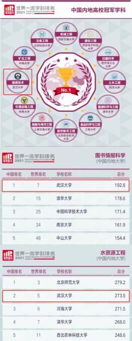 在2021软科世界一流学科排名,学校遥感技术连续5年排名全球第一,水资源工程、图书情报科学2个学科排名全球前十;在2022年QS世界大学学科排名中,武汉大学共有30个学科入选世界前500,16个学科入选世界前200,3个学科入围世界前100,其中图书馆及信息管理、哲学、口腔医学3个学科入围世界前50;在第四轮学科评估中,武汉大学马克思主义理论、地球物理学、测绘科学与技术、图书情报与档案管理4个学科获评A+,19个学科获评A类学科;在2022年2月公布的第二轮“双一流”建设名单中,武汉大学理论经济学、法学、马克思主义理论、化学、地球物理学、生物学、土木工程、水利工程、测绘科学与技术、口腔医学、图书情报与档案管理等11个学科入选,入选学科数量位居湖北省首位;2021年软科中国最好学科排名中,学校56个学科上榜,5个学科获评“中国顶尖学科”;在2021软科世界一流学科排名中,武汉大学遥感学科位居世界第1,水资源工程、图书情报科学两个学科排名世界前10;在最新发布的ESI学科排名中,武汉大学共有18个学科进入ESI前1%,其中6个学科进入ESI前1‰。