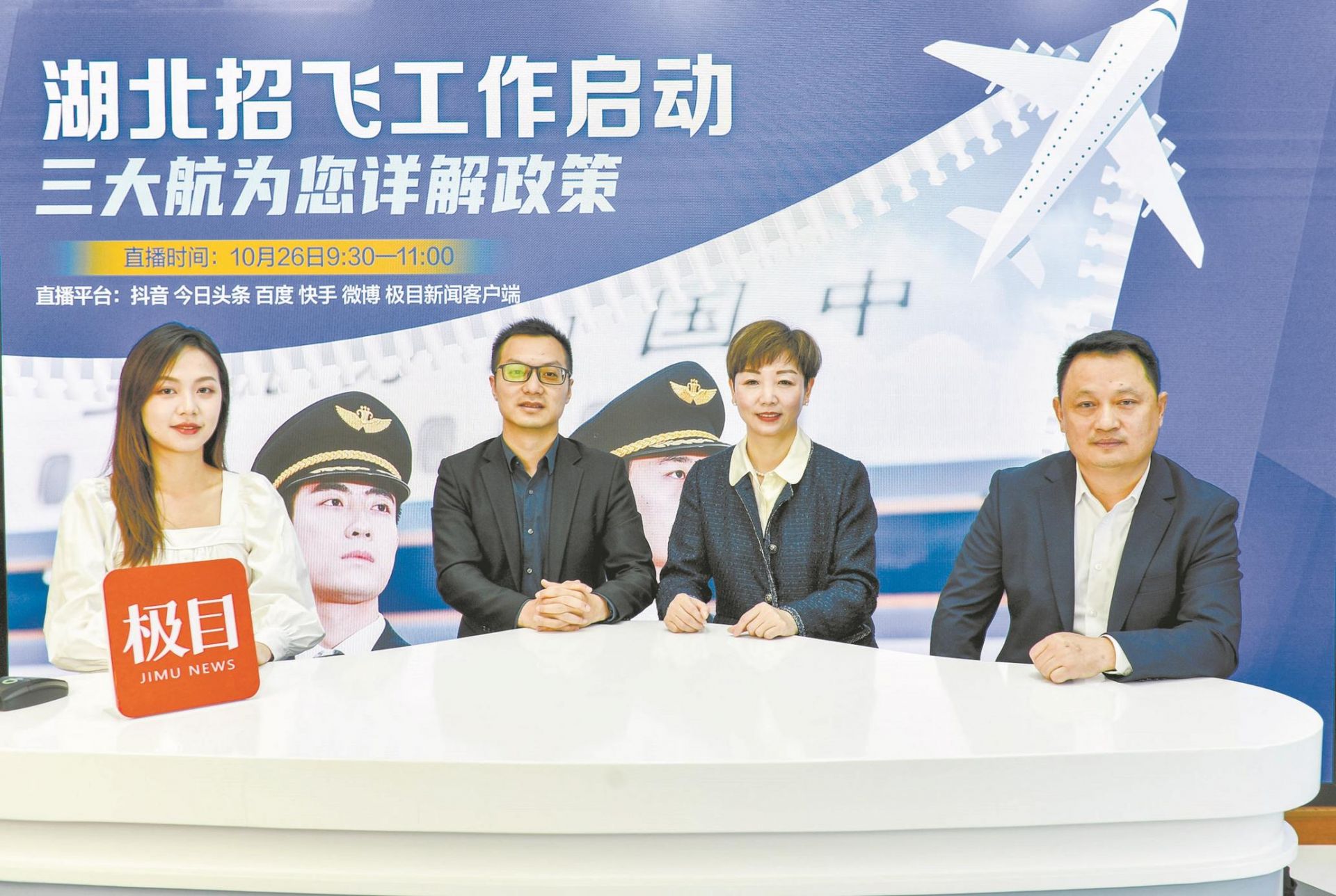 三大航招飞负责人做客极目新闻直播间,右一为南航湖北分公司招飞负责人曾从涛,右二为国航湖北分公司招飞负责人付冬梅,右三为东航武汉公司招飞负责人钱振瑞