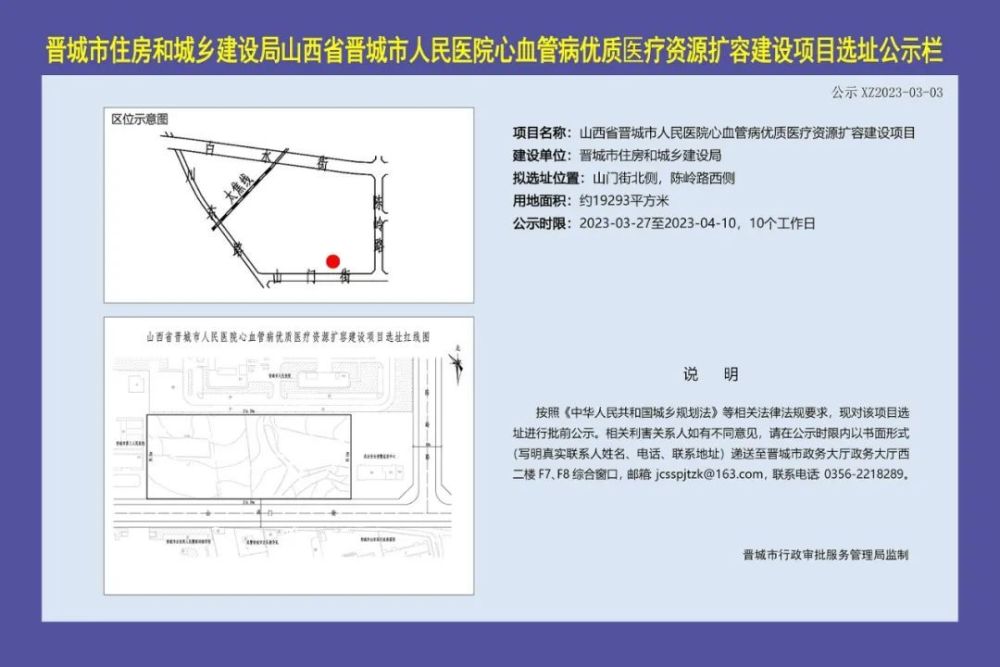 3月27日,市住建局发布了《市人民医院心血管病优质医疗资源扩容建设项目选址公示》,选址位于山门街北侧、陈岭路西侧(新市医院南侧),占地面积1. 9293公顷。
