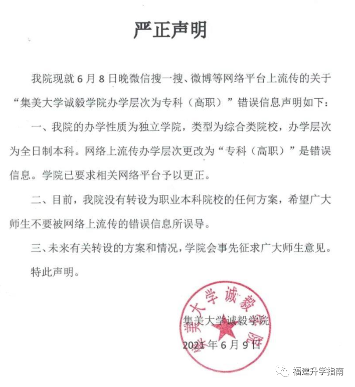 6月,集美大学诚毅学院官方微信就6月8日晚微信搜一搜、微博等网络平台上流传的关于“集美大学诚毅学院办学层次为专科(高职)”错误信息,发布严正声明: