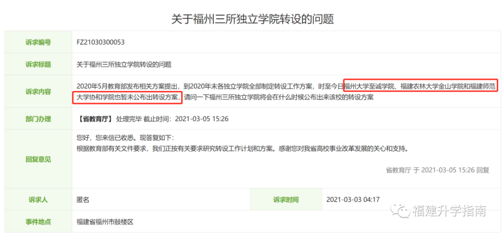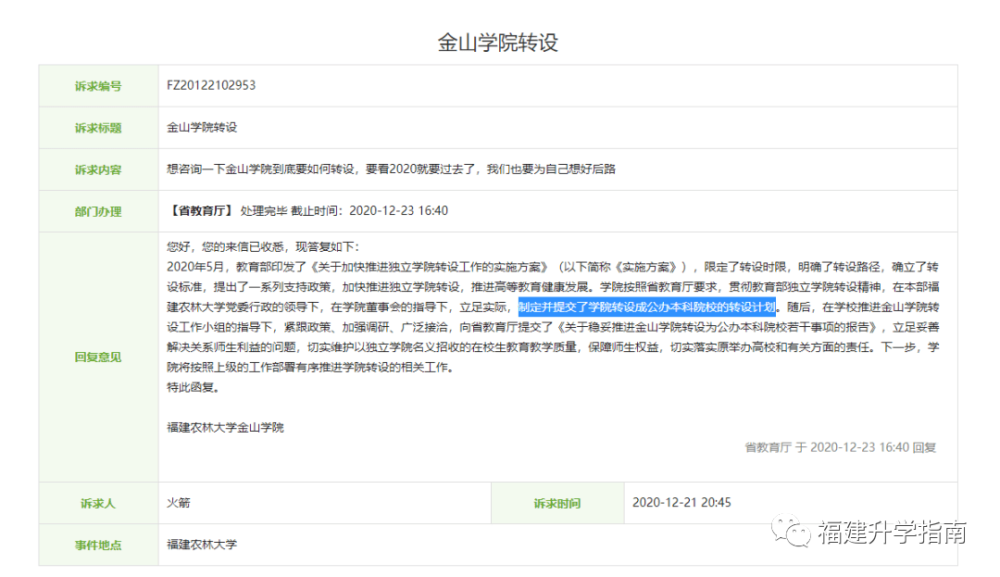 2020年,有网友在“福州市12345便民(惠企)服务平台”对福建农林大学金山学院转设进展发起咨询。