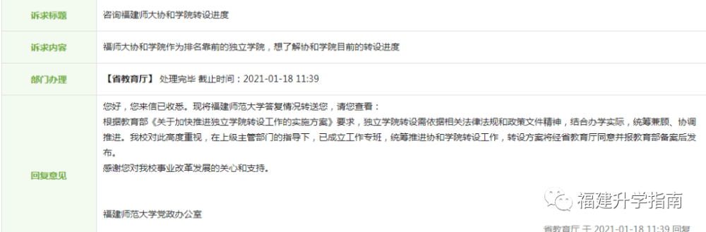 今年1月,有网友在福州12345政务平台咨询:福师大协和学院作为排名靠前的独立学院,想了解协和学院目前的转设进度。